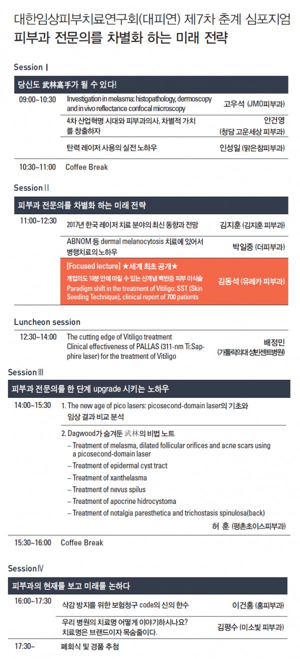 이번 제7차 대피연 춘계 심포지엄에서 회원 여러분들께서는 백반증 치료의 새롭고 놀라운 임상경험을 하시게 될 것입니다. GPT에 이어서 세계 최초로 오로지 대피연에서만 들을 수 있는 SST 강의에 많은 기대와 관심 부탁드립니다.