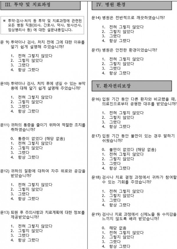 실제 문항을 보면 의사 진료서비스로는 ▲담당 의사는 귀하를 존중하고 예의를 갖추어 대하였습니까? ▲담당 의사는 귀하의 이야기를 주의 깊게 들어 주었습니까? ▲귀하나 보호자가 담당 의사를 만나 이야기할 기회가 자주 있었습니까? ▲귀하는 담당 의사의 회진시간 또는 회진시간 변경에 대한 정보를 제공 받으셨습니까? 와 같은 내용이 포함됐다.