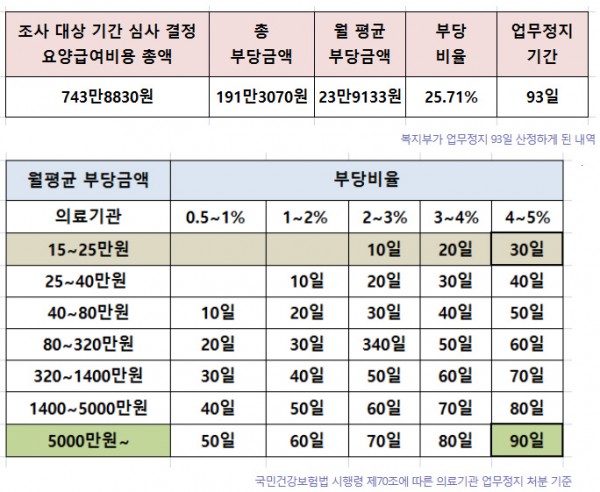 총액을 조사 기간인 8로 나눠 월 평균 부당액을 23만9133원로 정한 후 이 금액이 요양급여 76만1473원에서 차지하는 비율 25.71%를 부당비율로 보고 업무정지 기간을 93일로 정한 것이다.