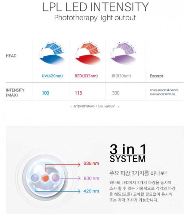 635nm(RED), 420nm(BLUE) 파장을 이용하여 2W/cm2 미만의 출력광선을 (적외선 및 자외선 제외)을 인체에 조사하여 치료 등에 사용