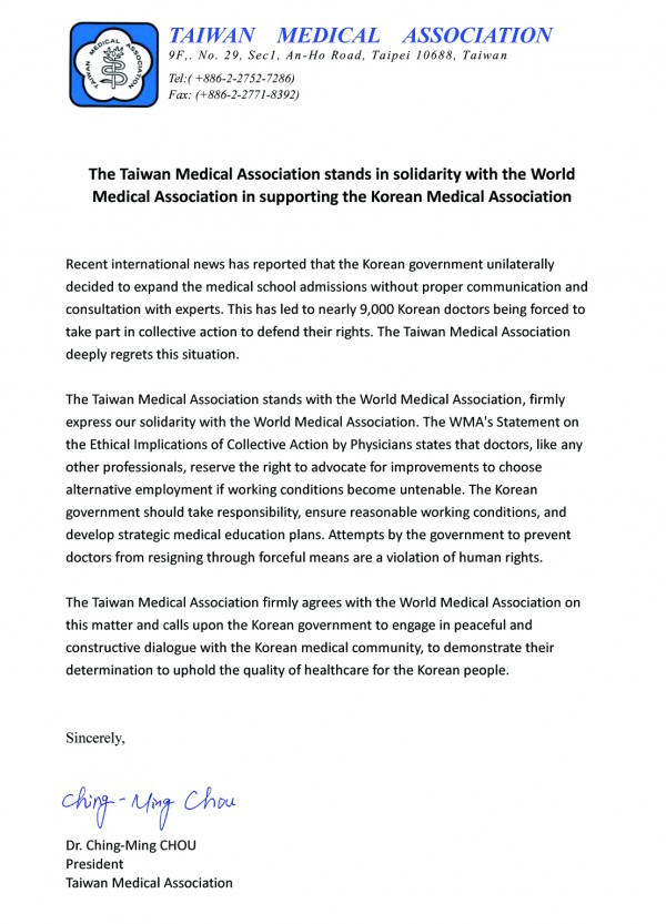 이에 대만의사회는 이 문제에 대해 세계의사회와 함께 대만민국 정부가 대한민국 의료계와 평화적이고 건설적인 대화를 통해 국민의 건강증진과 의료서비스 질 향상을 위한 확고한 결의를 보여줄 것을 강력히 촉구합니다.