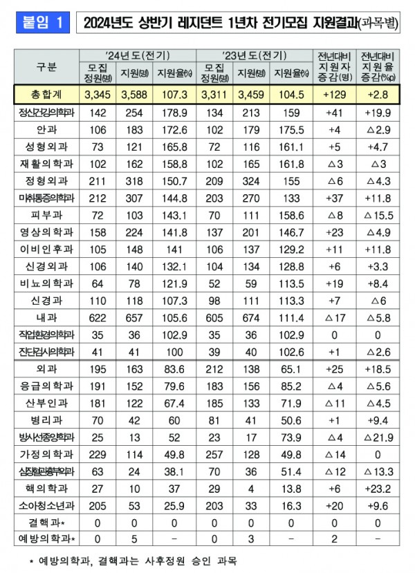 1. 2024년도 상반기 레지던트 1년차 전기모집 지원결과(과목별)