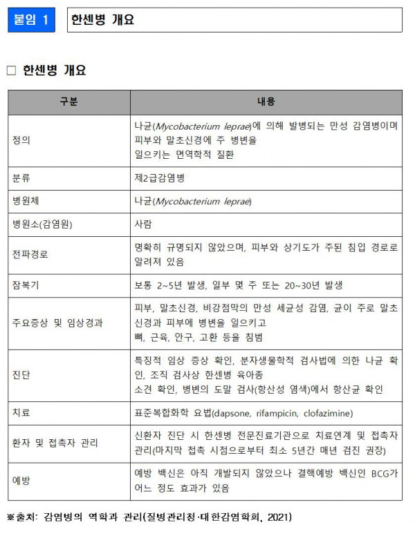 □ 질병관리청은 한센병 종식을 위해서는 외국인 신환자의 조기발견과 치료가 중요하다고 보고, 외국인 대상 한센병 검진 사업을 강화할 계획이다.