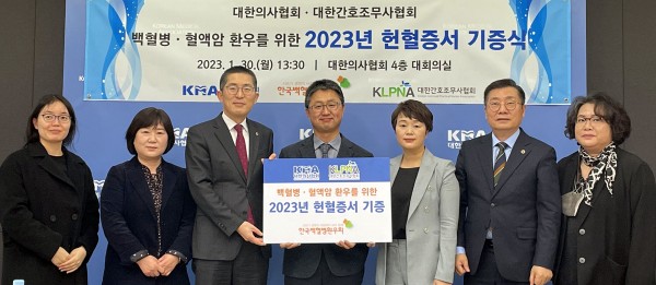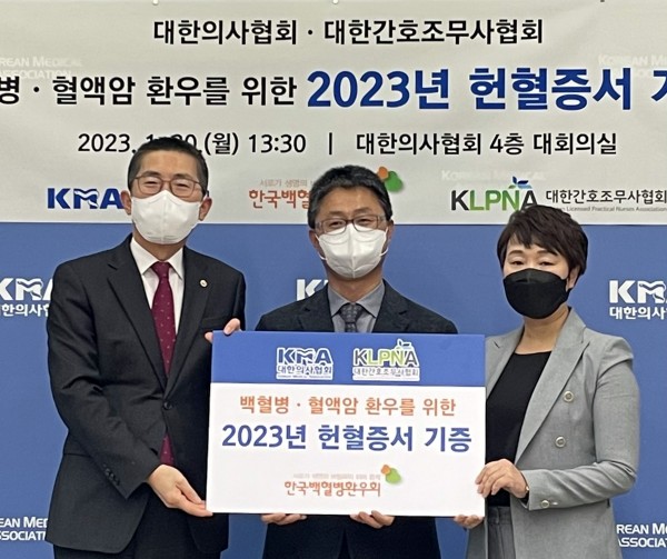 대한의사협회(회장 이필수)와 대한간호조무사협회(회장 곽지연)가 <임직원 2023 신년 헌혈캠페인>을 통해 모은 헌혈증서를 30일 한국백혈병환우회(대표 안기종)에 모두 기증했다.