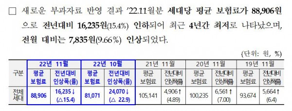 □ 새로운 부과자료 반영 결과 ’22.11월분 세대당 평균 보험료가 88,906원으로 전년대비 16,235원(15.4%) 인하되어 최근 4년간 최저로 나타났으며, 전월 대비는 7,835원(9.66%) 인상되었다.