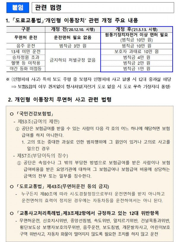 ○ ‘개인형 이동장치’ 대중화에 따른 안전사고 예방 목적으로 무면허 운전금지 등 운전자 주의의무가 대폭 강화된 개정「도로교통법」이 지난 해 2021년 5월 13일 시행된 이래 1년 이상이 경과하였으나,