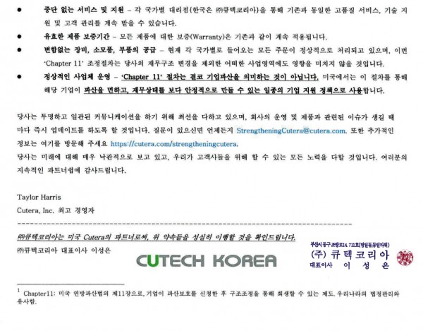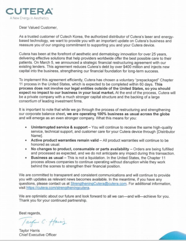 [큐텍 코리아]큐테라CUTERA 자발적 파산보호신청 후 비상장전환에 따른 안내문