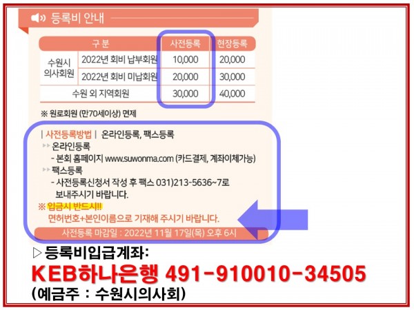 ▷등록비’입금‘계좌: KEB하나은행 491-910010-34505 (예금주 : 수원시의사회)