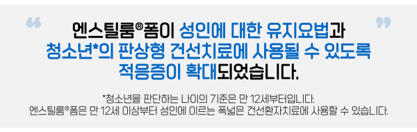 2022년 4월 6일자로, 엔스틸룸®폼이 성인에 대한 유지요법과 청소년*의 건선치료에도 사용될 수 있도록 적응증이 확대되었습니다.
