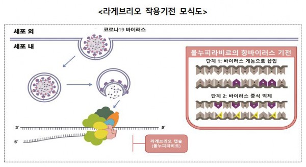 □ ‘라게브리오캡슐’은 리보핵산(RNA) 유사체로 코로나19 바이러스의 복제과정에서 리보핵산 대신 삽입되어 바이러스 사멸을 유도하는 의약품입니다.