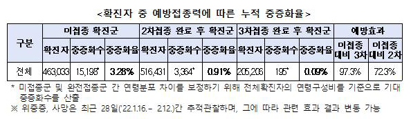 □ 2월 2주차 확진자에서 예방접종력에 따라 중증 진행을 평가한 결과 ‘3차접종 후 확진군’은 ‘미접종 후 확진군’에 비해 중증(사망 포함)으로 진행할 위험이 97.3%, ‘2차접종 후 확진군’도 ‘미접종 후 확진군’에 비해 72.3% 낮게 나타났다.
