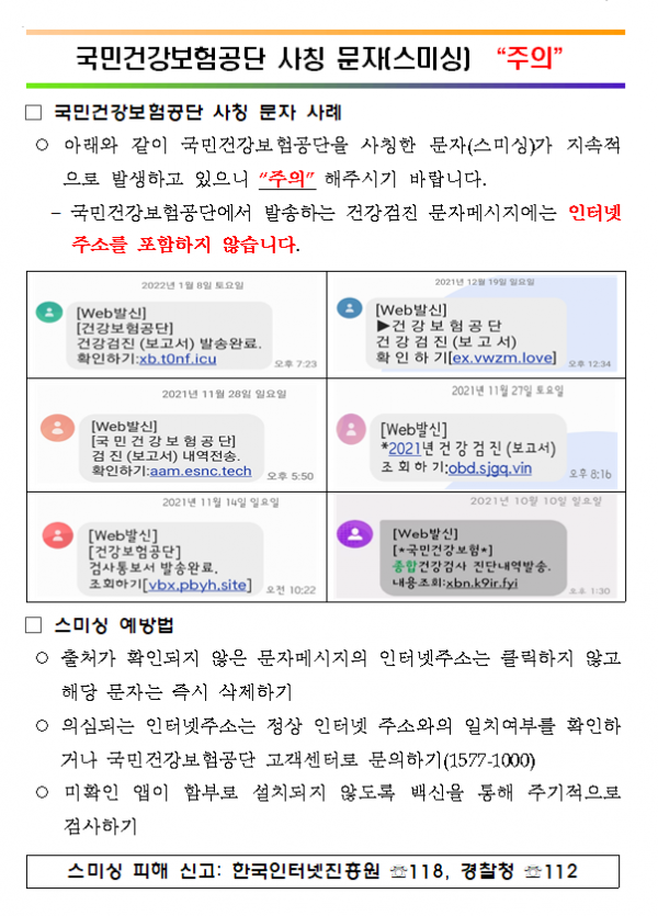 [건보공단]국민건강보험공단 사칭 문자(스미싱) “주의” 대피연 메일보내기 이름으로 검색 0 12,156 2022.01.28 11:25 첨부파일 - 첨부파일: 스미싱.png (128.3K) 474 짧은주소 - 짧은주소: https://www.laserpro.or.kr:443/bbs/?t=9u8 주소복사 × 짧은 글주소 복사 Note! 위 주소를 드래그, 복사(Ctrl+C)하여 사용하세요. 이전글다음글 목록 본문 [건보공단]국민건강보험공단 사칭 문자(스미싱) “주의” 이전글다음글 목록 댓글목록 등록된 댓글이 없습니다.