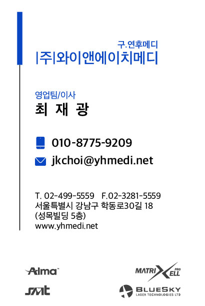 (주)와이앤에이치메디(구.연후메디)Y&H medi 대피연 메일보내기 이름으로 검색 0 12,424 2021.12.01 17:32 첨부파일 - 첨부파일: 연후메디최재광이사.jpg (55.5K) 525 짧은주소 - 짧은주소: https://www.laserpro.or.kr:443/bbs/?t=98A 주소복사 × 짧은 글주소 복사 Note! 위 주소를 드래그, 복사(Ctrl+C)하여 사용하세요. 이전글다음글 목록 본문 (주)와이앤에이치메디(구.연후메디)Y&H medi 이전글다음글 목록 댓글목록 등록된 댓글이 없습니다.