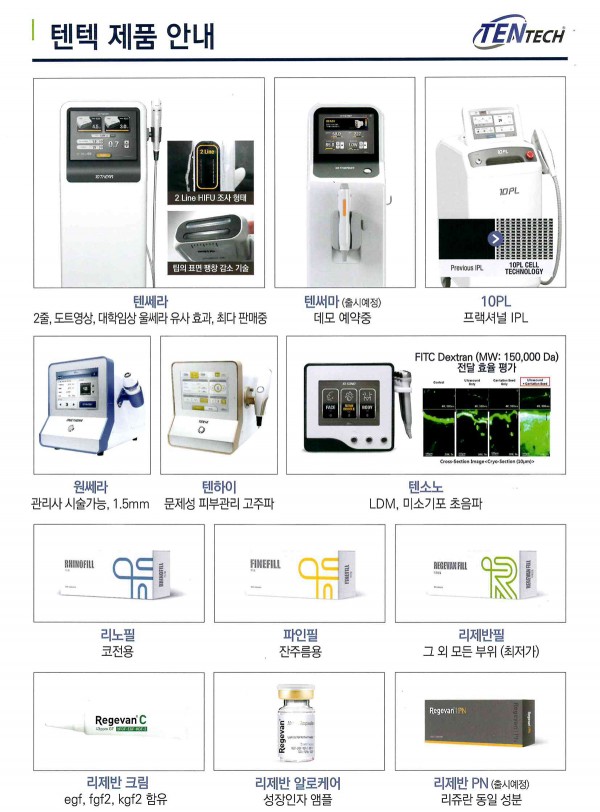주요 제품군으로는 10THERA(HIFU), 10PL(IPL), 10CELL(CO2 fractional laser), 10Cog(Thread), RegevanC(재생크림) 등이 있다고 합니다.