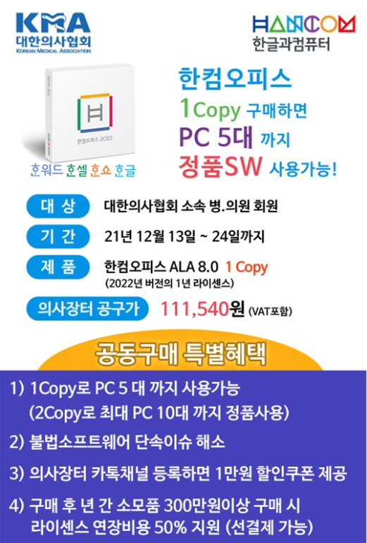 [의사장터]한컴오피스 정품SW 공동구매 안내 (111,540원, 12/24 마감)