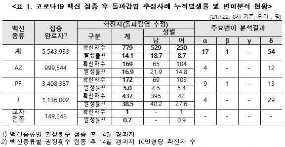 - 국내 접종완료자 5,543,933명 중 돌파감염 추정 사례 779명 발생