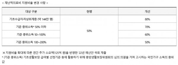 ○ 이는 그간 동일한 지원비율에 따라 상대적으로 저소득층의 의료비 부담 체감도가 더 높고, 코로나19로 인해 가계소득이 감소된 상황 속에서, 과도한 의료비 부담에 따른 위기 상황에 선제적으로 대응하여 저소득층의 의료보장을 강화하기 위한 것이다.