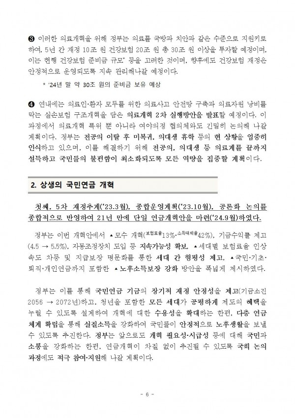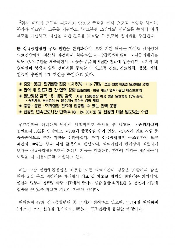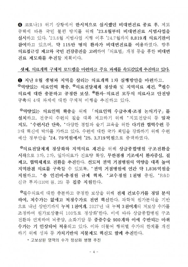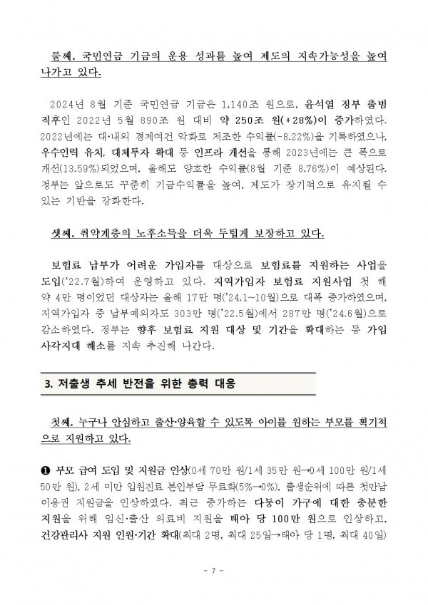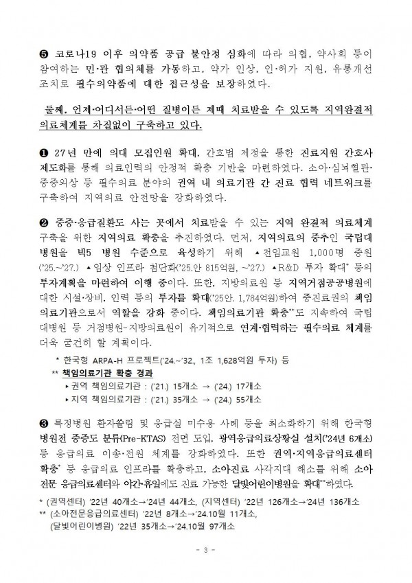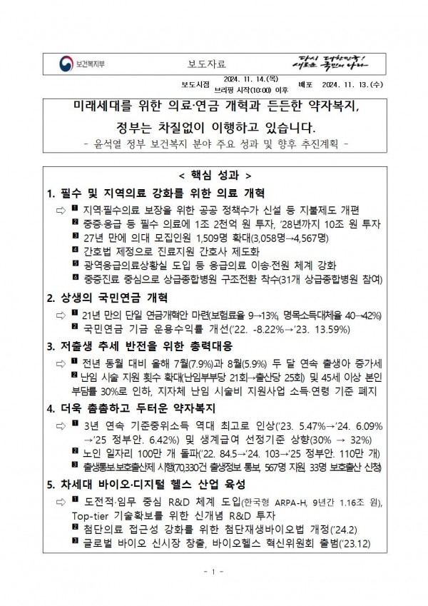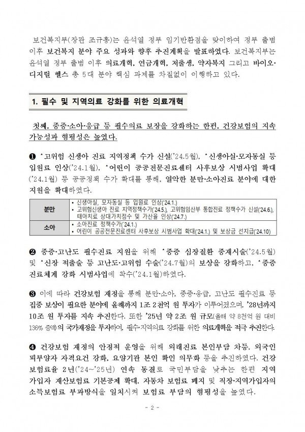 [복지부]윤석열 정부 보건복지 분야 주요 성과 및 향후 추진계획 대피연 메일보내기 이름으로 검색 0 6,623 2024.11.14 09:28 첨부파일 - 첨부파일: [복지부]윤석열 정부 2년 반 주요성과 및 향후 추진계획.hwp (141.0K) 523 짧은주소 - 짧은주소: https://laserpro.or.kr:443/bbs/?t=ezO 주소복사 × 짧은 글주소 복사 Note! 위 주소를 드래그, 복사(Ctrl+C)하여 사용하세요. 이전글다음글 목록 본문 [복지부]윤석열 정부 보건복지 분야 주요 성과 및 향후 추진계획< 핵심 성과 >1. 필수 및 지역의료 강화를 위한 의료 개혁.지역·필수의료 보장을 위한 공공 정책수가 신설 등 지불제도 개편 .중증·응급 등 필수 의료에 1조 2천억 원 투자, ’28년까지 10조 원 투자 .27년 만에 의대 모집인원 1,509명 확대(3,058명→4,567명).간호법 제정으로 진료지원 간호사 제도화 .광역응급의료상황실 도입 등 응급의료 이송·전원 체계 강화 .중증진료 중심으로 상급종합병원 구조전환 착수(31개 상급종합병원 참여) 이전글다음글 목록 댓글목록 등록된 댓글이 없습니다.