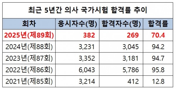 [국시원]2025년 신규의사 '269명' (역대 최저), 합격률 70.4%