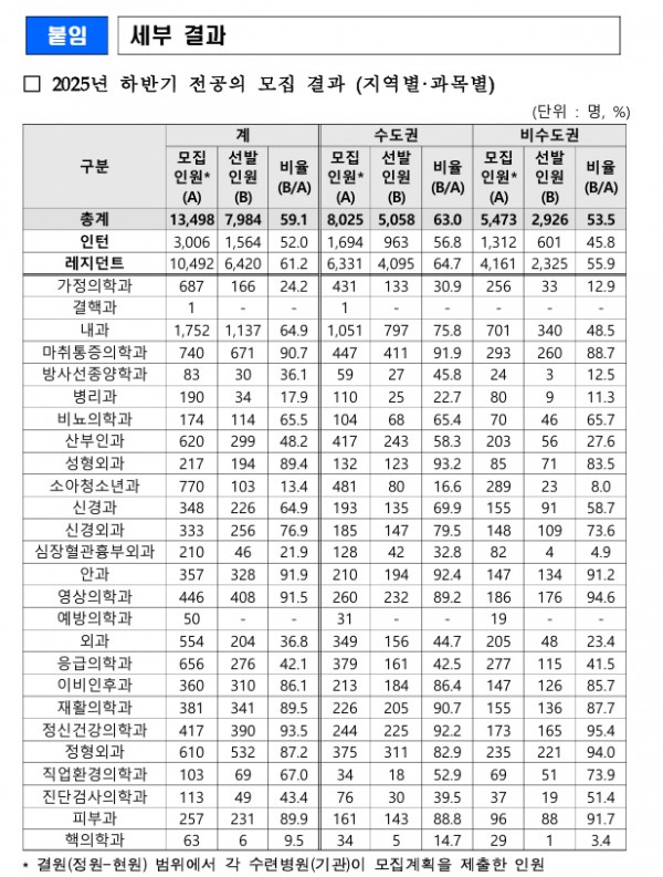 보건복지부(장관 정은경)와 수련환경평가위원회(위원장 유희철)는 9월 2일(화) 2025년도 하반기 전공의 모집 결과를 발표하였다.