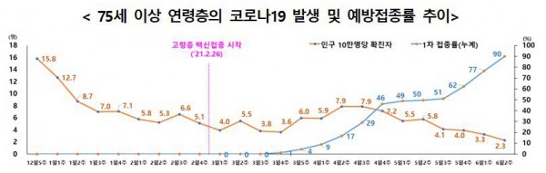 75세 이상 고령층의 경우 지난해 12월 5주차 인구 10만 명당 15.8명의 발생률을 보였으나, 4월 3주차(7.9명) 이후 환자 발생이 급격히 감소하면서, 예방접종률이 90%에 도달한 6월 2주차에는 인구 10만 명당 발생률이 2.3명으로 줄었다.
