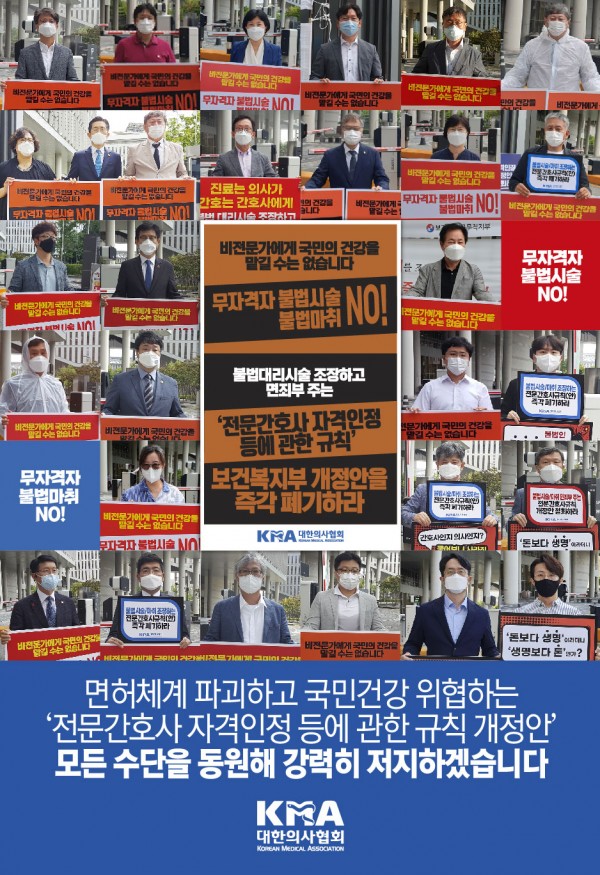 보건복지부 세종청사 앞에서 ‘전문간호사 자격인정 등에 관한 규칙 개정안’에 결사반대하는 의료계 릴레이 1인시위와 릴레이 성명 발표가 이어지고 있는 가운데, 대한의사협회(회장 이필수)가 “현재 입법예고중인 개정안은 국민건강을 지키기 위해 반드시 전면 재검토해야 한다”는 입장을 재천명했다.