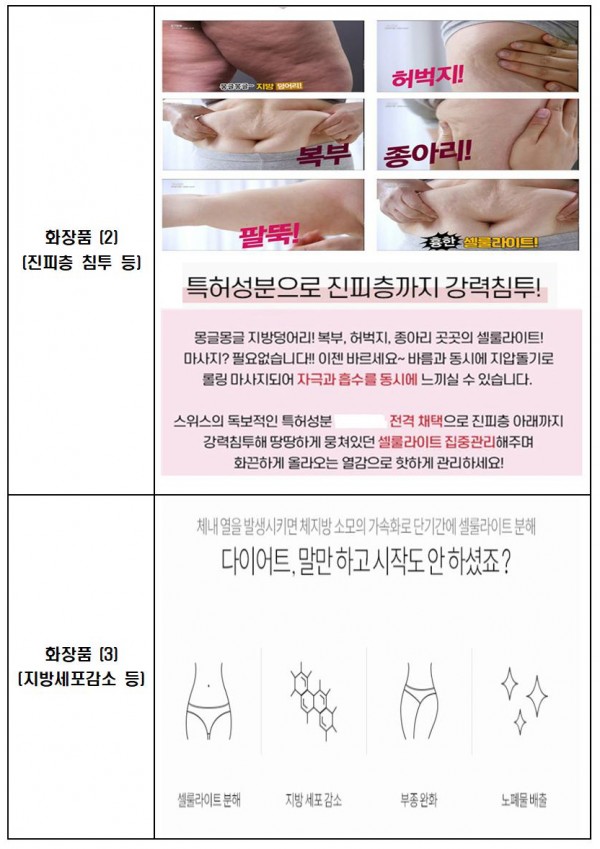 셀룰라이트 제품 온라인 광고 502건을 점검한 결과 ▲‘지방제거·감소’, ‘셀룰라이트 분해’ 등 의약품으로 오인할 수 있는 광고(328건) ▲‘진피층 흡수’, ‘침투’ 등 소비자들이 효과 등을 오인할 수 있는 광고(8건) 등 총 336건을 적발했습니다.
