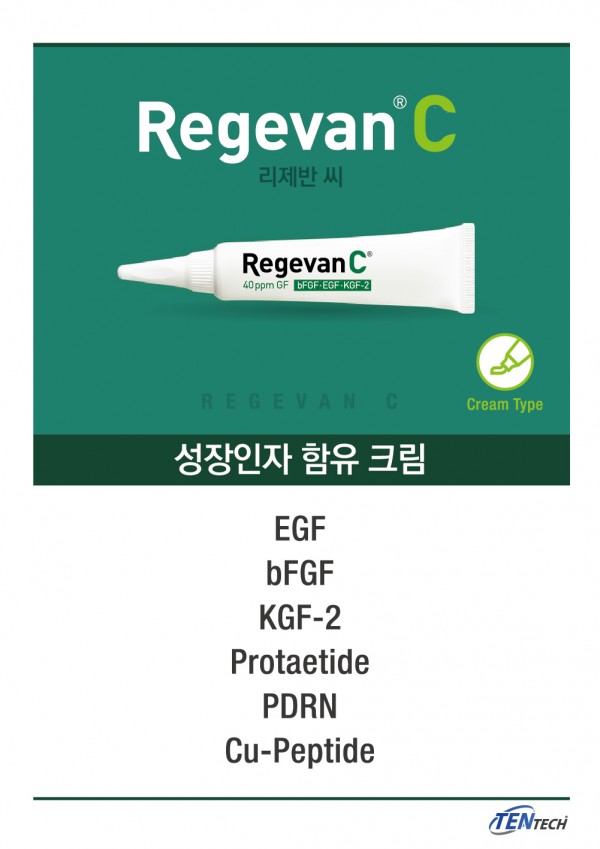 ㈜텐텍에서 ‘성장인자 3종(bFGF, EGF, KGF-2)’을 함유한 ‘Regevan C’크림을 출시 했다고 합니다.
