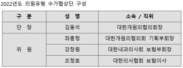 의원유형 수가협상단장은 김동석 대개협 회장이 맡으며, 위원으로 좌훈정 대개협 기획부회장, 강창원 대한내과의사회 보험부회장, 조정호 의협 보험이사가 참여한다.