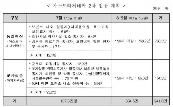 ○ 상반기 아스트라제네카 접종자 중 7월∼9월까지 2차 접종 대상자(약 942만 명)와 백신은 다음과 같다.