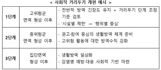 안정화 이후에는 정책 효과를 유지하면서도 국민의 피로감을 줄이기 위해, 예방접종 상황을 고려하여 사회적 거리두기를 개편할 계획이다.