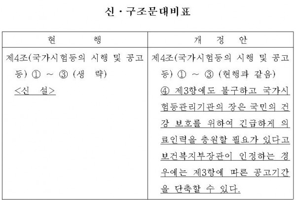 이번 개정안은 코로나19 상황과 같이 국민의 건강권․생명권 등 국민의 건강보호와 위기상황 대응을 위하여 필요한 경우, 의료인 국가시험의 공고기간을 단축하여 신속히 의료인력을 충원함으로써 즉각 의료현장에 대응하기 위한 것이다.
