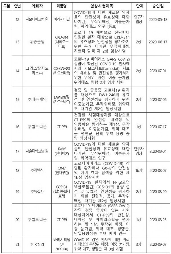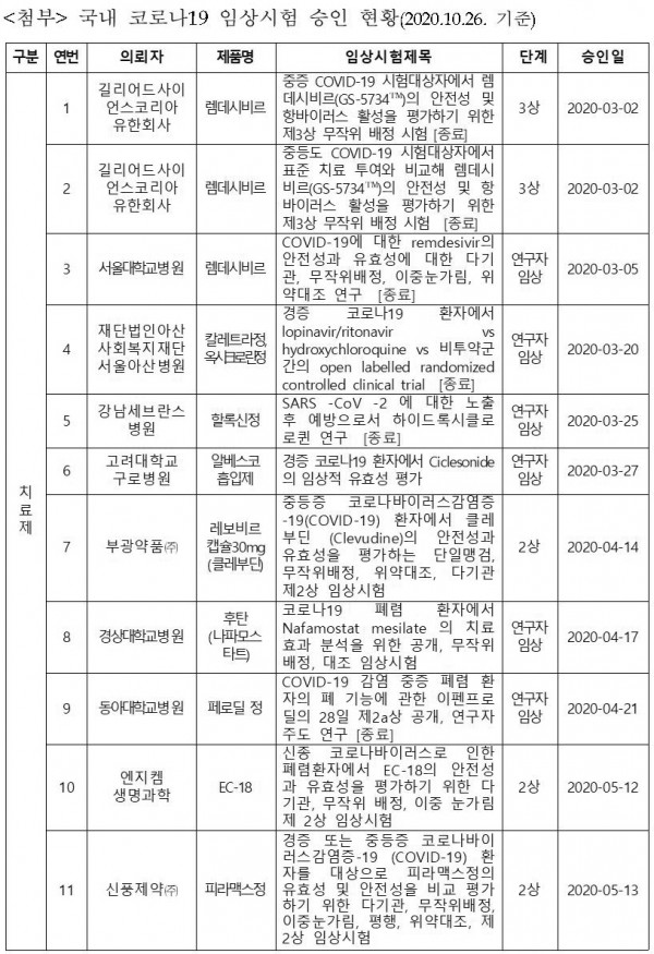 * 렘데시비르(3건), 옥시크로린정·칼레트라정, 할록신정, 바리시티닙, 페로딜(각 1건)