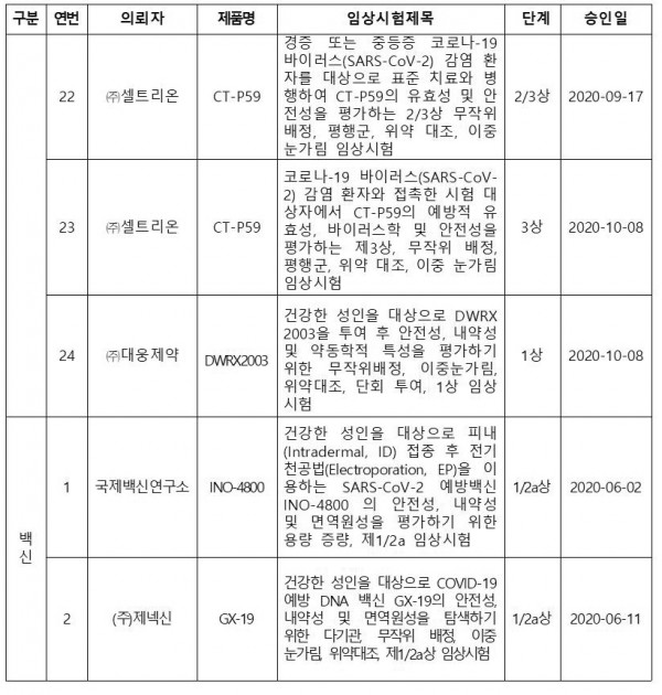 [식약처]코로나19 치료제·백신 임상시험 등 진행 현황