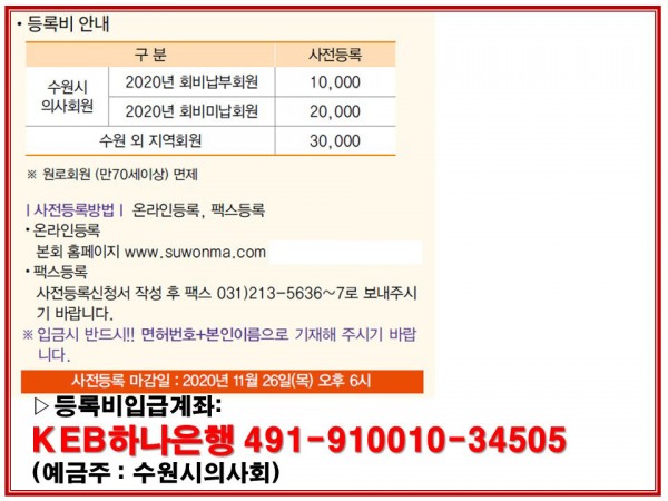 ▷등록비’입금‘계좌: KEB하나은행 491-910010-34505 (예금주 : 수원시의사회)