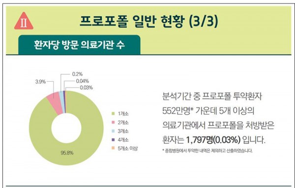 이번 도우미 서한의 대상인 마약류 3종의 처방환자 수는, 졸피뎀 184만 명(국민 28명 중 1명), 프로포폴 798만 명(국민 6.5명 중 1명), 식욕억제제 134만 명(국민 39명 중 1명)으로, 프로포폴의 사용이 가장 많았습니다.