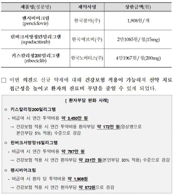 3개 의약품은 임상적 유용성, 비용 효과성, 관련 학회 의견, 제외국 등재현황 등에 대해 심사평가원의 약제급여평가위원회 평가, 건강보험공단과 협상을 거쳐 상한금액(또는 예상청구액)이 결정되었다.