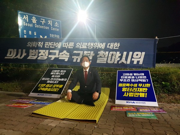 고의가 아닌 선의에 의한 최선의 진료과정에도 불구하고 의사를 법정 구속한 판결과 관련해 대한의사협회가 강력히 반발하고 있는 가운데, 14일 밤에는 서울구치소 앞에서 철야 릴레이 1인시위로 사법만행을 규탄하고 나섰다.