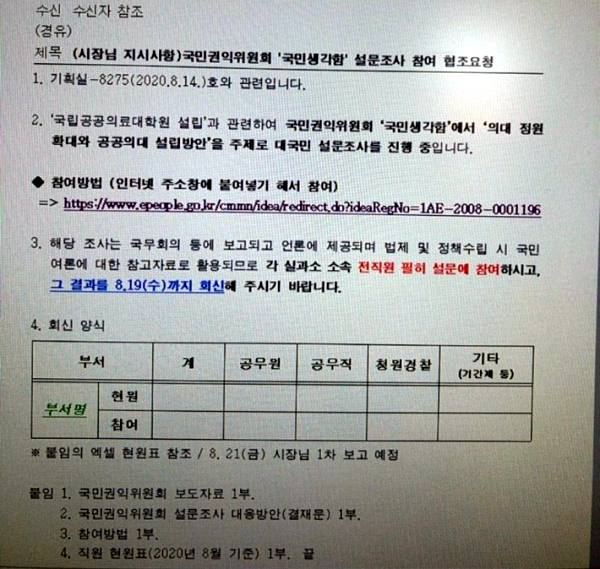 [의협]권익위 설문조사 편파 문항에 여론조작, 일부 지자체 '시장님 지시'로 소속 공무원과 가족까지 참여 종용