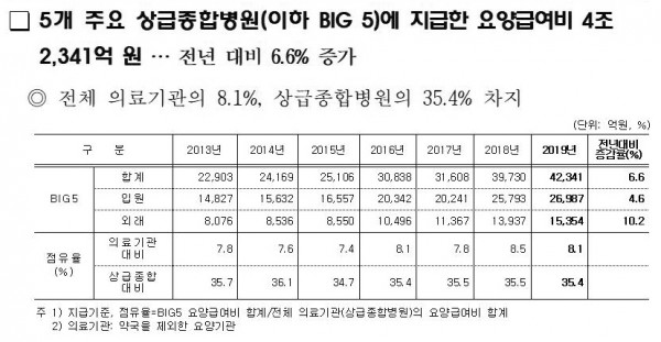 5곳의 상급종합병원에 지급된 급여비는 4조2,341억원으로 2018년도(3조9,730억원)보다 2,611억원 증가했다.