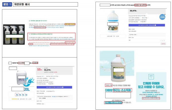 이번에 적발된 업체는 기구등 살균소독제를 ‘손소독제’, ‘손세정제’, ‘손세척’ 용도라고 판매하면서, “실수로 마셔도 인체에 안전”, “온몸에 사용”해도 된다고 거짓·광고했으며, 또한, 코로나19를 예방하는 ‘소독약’, ‘소독액’, ‘방역용품’ 등으로 허위·과대광고 하며 판매한 것으로 확인되었습니다.