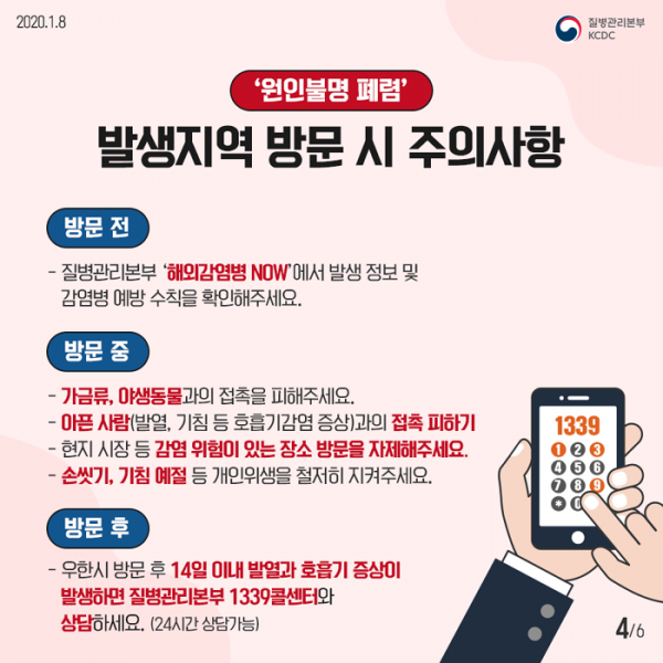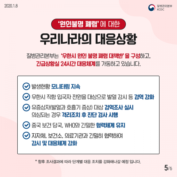 질병관리본부는 1월 3일(금)부터 중국「우한시 원인불명 폐렴 대책반」을 가동하고, 긴급상황실 24시간 대응체계를 운영중이다.