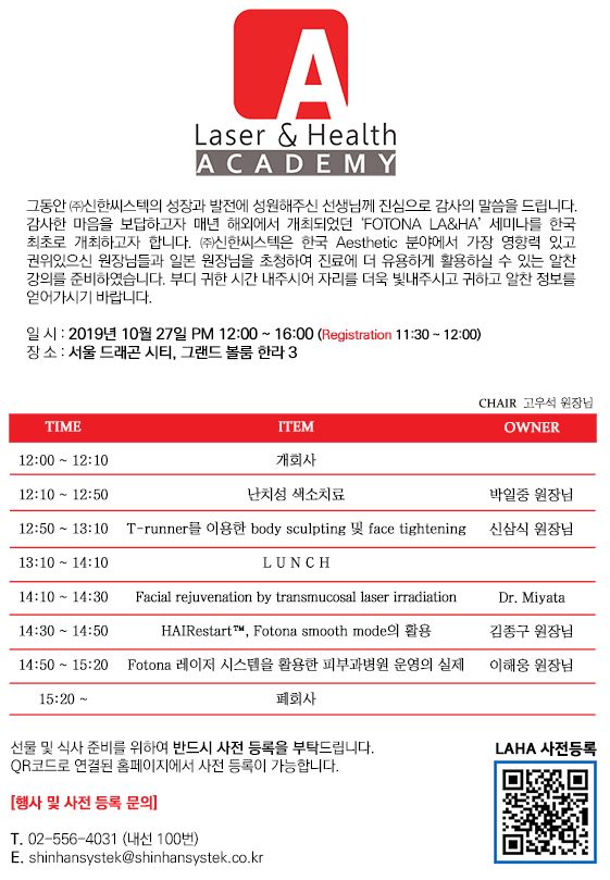 감사한 마음을 보답하고자 매년 해외에서 개최되었던 "FOTONA LA&HA" 세미나를 한국 최초로 개최하고자 합니다.