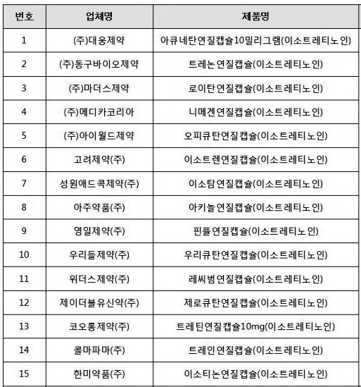 식약처가 지난해 이소트레티노인 제제에 대한 임신예방프로그램 가동을 예고한 이후 복제약 십수개가 무더기로 품목 자진 취하를 결정했다. 품목 자진 취하 신청은 지난해 4월부터 식약처가 업계 의견 수렴에 나선 이후 본격화됐다. 특히 지난해 9~10월에 집중됐다. 동아에스티, 일양바이오팜, 동광제약, 태극제약, 안국약품, 삼성제약, 삼천당제약 등 10개 제약사가 이소트레티노인 제제 품목을 취하했다.