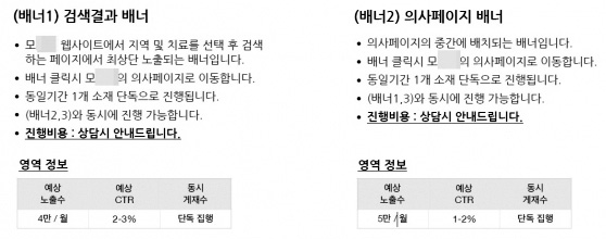 실제 [의협신문]이 입수한 '○○○' 사이트 소개서를 보면 '검색 결과 배너'에 대한 소개와 비용에 대한 언급을 찾을 수 있다. 소개서에는 '지역'이나 '치료과목'을 선택해 검색했을 때, 최상단에 노출되는 배너를 소개하며 비용은 '상담 시 안내드린다'는 문구를 달았다. '예상 노출 수'도 함께 제시하며 이른바 '광고 효과'를 어필하고 있다.