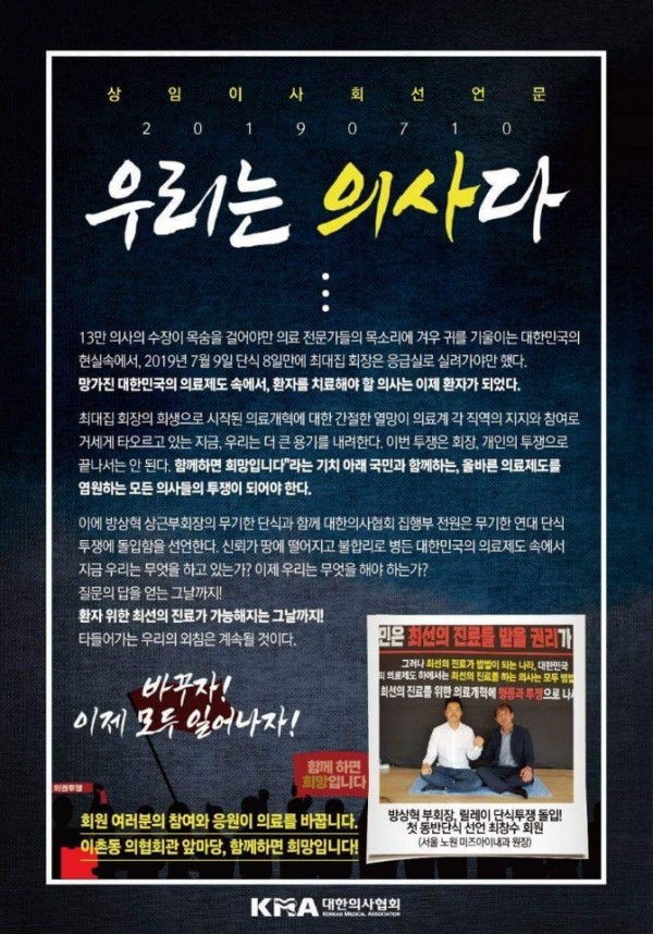 최대집 회장의 희생으로 시작된 의료개혁에 대한 간절한 열망이 의료계 각 직역의 지지와 참여로 거세게 타오르고 있는 지금, 우리는 더 큰 용기를 내려한다. 이번 투쟁은 회장, 개인의 투쟁으로 끝나서는 안 된다. "함께하면 희망입니다"라는 기치 아래 국민과 함께하는, 올바른 의료제도를 염원하는 모든 의사들의 투쟁이 되어야 한다.