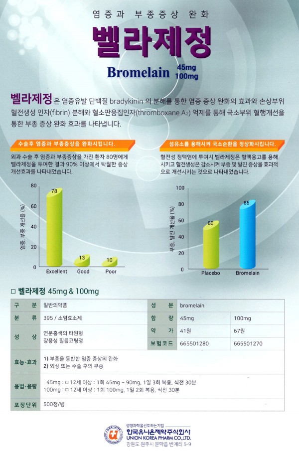 Bromelanin 45mg(100mg)으로 염증유발 단백질 bradykinin의 분해를 통한 염증 증상 완화의 효과와 손상부위의 fibrinolysis 와 thromboxane A2의 억제를 통해 국소부위 혈행개선을 통한 부종완화에 효과가 있다고 합니다.