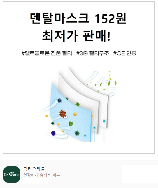닥터 오라클에서 ‘덴탈마스크’ 1매 152원에 판매한다고 합니다.