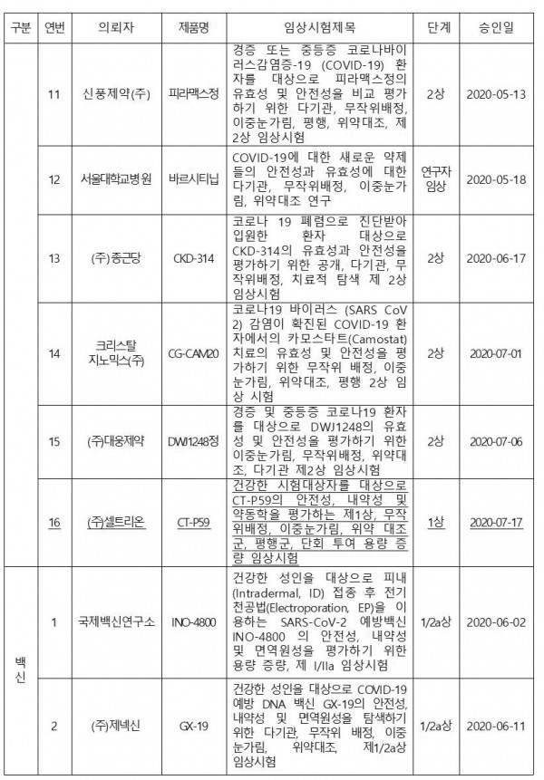 [식약처]국내 개발 코로나19 치료제 및 백신 임상 승인 현황(2020.7.17. 기준 13건)