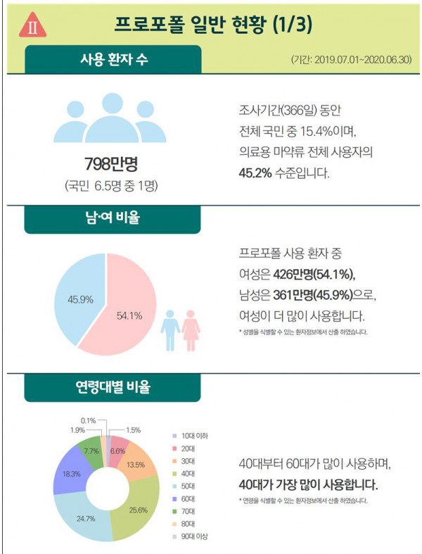 이번 도우미 서한의 대상인 마약류 3종의 처방환자 수는, 졸피뎀 184만 명(국민 28명 중 1명), 프로포폴 798만 명(국민 6.5명 중 1명), 식욕억제제 134만 명(국민 39명 중 1명)으로, 프로포폴의 사용이 가장 많았습니다.